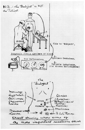 - Ein von ihm erfundener Dynomizer sollte analog zu einem Rundfunkempfänger funktionieren und Krankheiten anhand von Blutproben diagnostizieren können. Patienten brauchten ihm dazu lediglich einen eingetrockneten Blutstropfen in einem Brief zusenden und er wollte dann eine Diagnose stellen können. Analog stellte er auch telefonische Ferndiagnosen. Der Dynomizer wurde zu einem kommerziellen Erfolg in den USA; er konnte entweder gekauft oder gemietet werden. Der Käufer musste allerdings unterschreiben, das Gerät niemals zu öffnen. Anwender von Dynomizern stellten zumeist alarmierende Diagnosen wie Krebs, Diabetes oder bis dato unbekannte Erkrankungen wie eine "bovine syphilis".