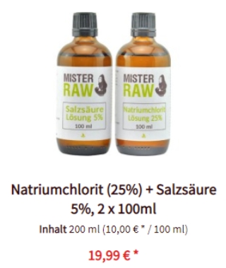 von Vulcaneanu angebotene Produktkombination von "Mister Raw" zur Selbstherstellung von Chlordioxid (MMS). Das ursprüngliche als solches gekennzeichnete MMS-Produkt wurde zwischenzeitlich aus dem Angebot genommen.