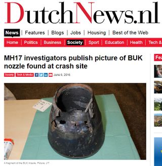 Das russische Verteidigungsministerium räumte 2016 ein, dass es kein fremdes Flugzeug in der Nähe der Maschine MH17 gab. Die über zwei Jahre von der russischen Propaganda behauptete Geschichte eines oder zweier ukrainischer Flugzeuge, die die MH17 abgeschossen haben könnten, wurde von russischen Generälen selbst dementiert. Des weiteren wurden Fragmente einer BUK Rakete am Absturzort gefunden. (siehe Bild)