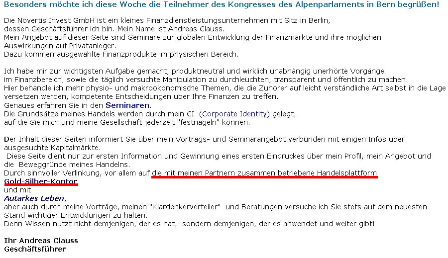 4. Screenshot von 2008, demzufolge Claus mit Partnern die "Handelsplattform Gold Silber Kontor" betreibt.