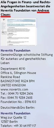 Briefkastenadresse der "Novertis Foundation" im englischen Basingstoke
