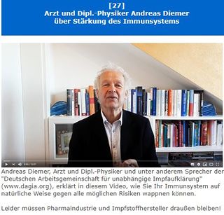 Andreas Diemer (geb. 1951) ist ein deutscher Arzt und Physiker aus Gernsbach und Vertreter der pseudomedizinischen Quantenmedizin. Diemer ist Mitbegründer und Ausbilder bei der "Akademie Lebenskunst und Gesundheit" AKALEKU[2]. Die Akademie bildet Personen (explizit auch Medizinlaien) zum "Gesundheitscoach SKE (Selbstheilung/ Kreativität/ energetische Medizin" aus. Er wird mindestens seit 2015 als Fachbeirat der impfgegnerischen Organisation "Deutsche Arbeitsgemeinschaft für unabhängige Impfaufklärung" (DAGIA) aus Herrenberg genannt, die vom Medizinlaien und Impfgegner Hans Tolzin iniziiert wurde und fungiert als DAGIA-Sprecher.