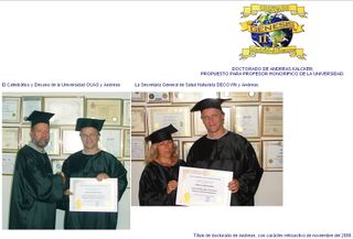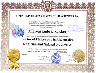 Schmuckurkunde eines von Andreas Kalcker geführten scheinakademischen Titels, der in Barcelona und Florida bei der Firma Open University of Advanced Sciences Inc. käuflich zu erwerben ist. Der Käufer kann sich das "Fachgebiet" selbst aussuchen. Der eigentliche Sitz der Firma OUAS ist jedoch in einer Seitenstraße in Barcelona.[2]
