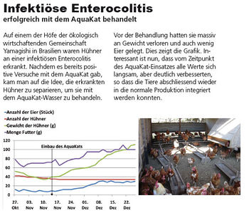 Auf den Webseiten des Herstellers Penergetic ist zu erfahren, dass das Esoterikprodukt Aquakat auch eine positive Wirkung auf infizierte Hühner habe. Dazu wird in anekdotischer Weise auf einen brasilianischen Hühnerhof "Yamagishi" verwiesen, wo Hühner mit infektiöser Enterocolitis von Aquakat profitiert hätten.