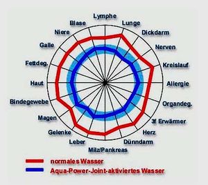 - "Die in vivo getesteten Veränderungen am menschlichen Körper durch den Genuss von „Aqua-Power-Joint”-aktiviertem Wasser zeigen über die gewählte Messmethode eine deutliche Verbesserung der Energiebilanz der Meridiane, was den Schluss zulässt, dass es zu einer allgemeinen Verbesserung der körperlichen Zustände der getesteten Personen gekommen ist."[7]