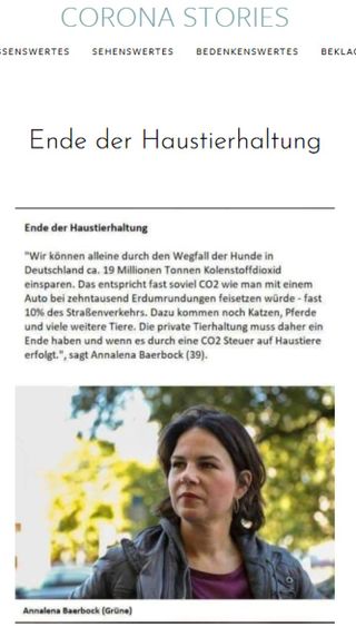 Auf der Webseite der Arbeitsgemeinschaft Corona-Stories werden Falschnachrichten verbreitet. So wird behauptet dass die Grünen-Parteivorsitzende und Kanzlerkandidatin Annalena Baerbock ein Haustierverbot befürworte. Kleintiere wie Hunde oder Katzen, aber auch Pferde würden demnach zuviel Kohlendioxid produzieren und schadeten dem Klima. Das entsprechende Sharepic wurde am 22. April 2021 hochgeladen.[10] Die entsprechende Seite bei Arbeitsgemeinschaft Corona-Stories weist in ihren Meta-Daten als Autor Sonja Schmidt aus (author content="Sonja Schmidt")[11] Baerbock war in der Vergangenheit bereits mehrmals auf diese Behauptung angesprochen worden und hatte diese als Fälschung bezeichnet. Die Pressestelle von Annalena Baerbock beantwortete eine diesbezügliche Anfrage wie folgt: