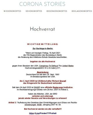 Verbreitet wird auf dem Portal auch ein Beitrag, der ganz typische Reichsbürgerargumentationen unkritisch wiedergibt. Demnach würden die gewählten Abgeordneten des Bundestages Hochverrat begehen. Ausserdem sei die Bundesrepublik Deutschland von den USA besetzt und der letzte US-Botschafter unter Donald Trump habe über Deutschland das Kriegsrecht verhängt. (siehe Bild rechts)