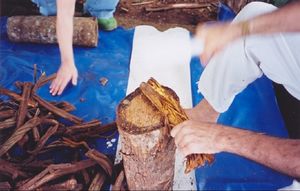 Das in der Esoterikszene verwendete und als Ayahuasca bezeichnete Getränk ist ein Tee, der aus der Ayahuasca-Liane hergestellt wird, dem weitere Pflanzen mit unterschiedlicher Wirkung beigemischt werden. Meist handelt es sich um das so genannte Chacruna, botanisch Psychotria viridis.[1] Aufgrund der möglichen unterschiedlichen Zusammensetzungen wird eine breite Palette von Wirkungen auf den menschlichen Organismus erreicht. Ayahuasca ist eine traditionell bei verschiedenen indigenen Völkern Südamerikas verwendete Droge, die dort von Medizinleuten zur Ermittlung von Krankheitsursachen eingesetzt wurde und wird.