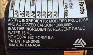 Aufkleber auf einem Mittel der Firma Delta Institute mit Fruchtzucker. Zu sehen ist die homöopathische Potenzierungsangabe 1.000.000X. Dies entspricht einer D1.000.000 Verdünnung um den Faktor 1:10.000.000 (1 Million mal 1:10). Üblicherweise wird jedoch in der Homöopathie im englischsprachigen Raum der Buchstabe X vorangestellt, in diesem Falle wurde er am Ende angefügt.