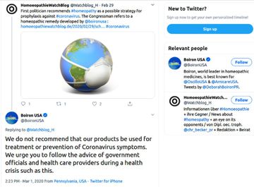 Die amerikanische Vertretung des Homöopathie-Pharmaunternehmen Boiron riet explizit ab, Homöopathie im Falle einer SARS2-Coronavirus Infektion einzusetzen.