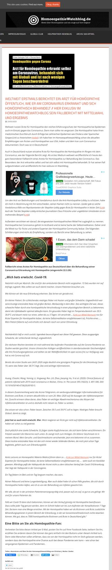 - Am 23. März 2020 berichtete der hamburger Pharmalobbyist Christian J. Becker in seinem homöopathiewatchblog über eine prinzipiell nicht nachprüfbare Wunderheilung von COVID-19 durch die Homöopathie. Da er den Namen des wundergeheilten Arztes nicht nennt, ist seine Anekdote nicht nachprüfbar. (siehe Webseite Homöopathiewatchblog in Galerie weiter unten als Beleg) Zuvor hatte sich Becker für eine homöopathische Prophylaxe der CoV-2 Infektion durch Homöopathie ausgesprochen. Am 29. Januar 2020 hatte Becker behauptet dass das homöopathische Hochpotenzmittel Arsenicum album 30 als prophylaktisches Mittel gegen Coronavirus-Infektionen eingesetzt werden könnte. Er berief sich dabei alleine auf die indische Ayush-Behörde (zur Förderung und Erforschung indischer traditioneller Heilmethoden), die er als indisches Gesundheitsministerium bezeichnet. Des weiteren empfahl er Homöopathie-Angebote gegen das Coronavirus durch die indischen Homöopathen Rajan Sankaran und Pratip Banerji.