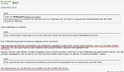 • Keine einzige der Elends-Krankheiten wie Diphtherie, Hepatitis B oder Polio würde zurück kehren, wenn wir mit dem Impfen aufhören. [...] Ich habe dreimal so viel Ahnung vom Impfen wie der Großteil der Ärzte.[39]