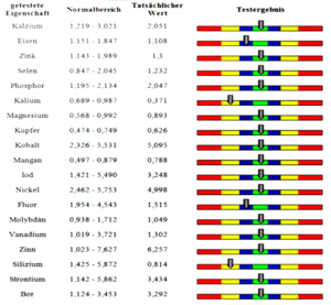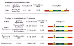 Für jeden dieser Bereiche wird im angeschlossenen Computer ein "Befundbericht" erstellt, das ist eine Liste mit Zahlenwerten, wobei jeweils der ermittelte Wert und der Sollbereich auf drei bis fünf Dezimalstellen angegeben sind. Beispielsweise kann es im Befundbericht "Spurenelemente" heißen, dass der Messwert für Magnesium 0,446 betrage und der Sollwert 0,568 bis 0,992. Maßeinheiten werden nicht genannt.