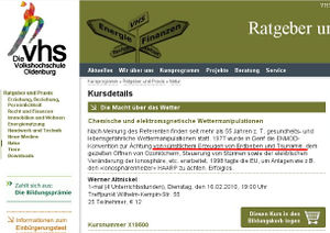 - ↑ Volkshochschule Oldenburg, Kursprogramm Ratgeber und Praxis, Natur. Die Macht über das Wetter - Chemische und elektromagnetische Wettermanipulationen. Nach Meinung des Referenten finden seit mehr als 55 Jahren z. T. gesundheits- und lebensgefährliche Wettermanipulationen statt. 1977 wurde in Genf die ENMOD- Konvention zur Ächtung von künstlichem Erzeugen von Erdbeben und Tsunamis, dem gezielten Öffnen von Ozonlöchern, der Steuerung von Stürmen sowie der elektrischen Veränderung der Ionosphäre, etc. erarbeitet. 1998 tagte die EU, um Anlagen wie z.B. den »Ionosphärenheizer« HAARP zu ächten. Erfolglos. Werner Altnickel. 1-mal (4 Unterrichtsstunden), Dienstag, den 16.02.2010, 19:00 - 22:00 Uhr. Treffpunkt: Wilhelm- Kempin-Str. 55 , 25 Teilnehmer, € 12 , Kursnummer X19500. Volkshochschule Oldenburg e.V. - Telefon: (0441) 92391-0 , Telefax: (0441) 92391-13 E-Mail: info@vhsol.de, Internet: www.vhs-ol.de , Wallstraße 17 (Am Waffenplatz) 26122 Oldenburg