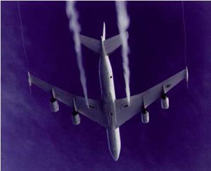 Verbreitet werden die abwegigen und nicht belegten Vermutungen auch in der esoterischen Zeitenschrift[16], im Neue Impulse Treff und bei lnc-2010 von Uwe Behnken. Ein beliebtes "Beweisfoto" für angebliche Chemtrailoperationen ist auf dem Foto rechts zu sehen: Ein zum Sprühen umgebauter Tankausleger einer Boeing NKC-135A Stratotanker (717-100) mit der Seriennummer 17244, stationiert auf der Edwards AFB in Kalifornien.[17] Gesprüht wurde daraus gelb eingefärbtes Wasser, welches auf ein dahinter fliegendes Flugzeug des Typs ATR-72 verteilt wurde und dann auf diesem gefror. So konnte das Vereisungsverhalten des Flugzeugs realitätsnah erforscht werden. Ein ATR-72 war in den USA im Jahre 1994 im Staate Indiana abgestürzt, und es wurde vermutet, dass der Absturz durch Vereisung verursacht wurde. Auch wurde das Vereisungsverhalten bei Jagdflugzeugen[18] und bei einer Embraer EMB-120RT[19] damit geprüft. Mittlerweile ist dieses Testflugzeug ausgemustert.
