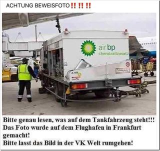 Im Herbst 2016 erschien im deutschsprachigen Internet ein weiteres gefälschtes Bild. Es zeigt einen Tankwagen, der die manipulierte Aufschrift "air bp chemtrailzusatz" zeigt. Das Bild soll einen Tankvorgang auf dem Flughafen Frankfurt zeigen. Wie sich aber leicht herausfinden lässt, wurde das Bild 2008 gemacht und wird in einem Wikipedia-Artikel veröffentlicht. Es zeigt - ohne das nachträglich hinzugefügte "Chemtrailzusatz" einen Tankwagen auf dem Flugplatz Wien. Dies ist unter anderem auch an einem Werbeaufkleber einer österreichischen Zeitung erkennbar, der sich links am Tankwagen befindet. Die Fälschung wurde durch mimikama aufgedeckt.[54]