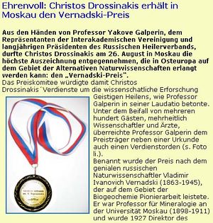 "Ehrenvoll: Christos Drossinakis erhält in Moskau den Vernadski-Preis ... aus den Händen von Professor Yakove Galperin, dem Repräsentanten der Interakademischen Vereinigung und langjährigen Präsidenten des Russischen Heilerverbands" lautet es auf der Webseite von Christos Drossinakis (Jahr 2009). Auch wird zum Preis angegeben, dass er die "höchste Auszeichnung" sei, "die für unkonventionelle Forschung in Osteuropa erlangt werden" könne. Was Drossinakis jedoch verschweigt, ist die Tatsache, dass die genannte "Interakademische Vereinigung" (eigentlich "Internationale Interakademische Vereinigung") in Wirklichkeit ein rein privates russisches Projekt mit engen Beziehungen zur so genannten International University of Fundamental Studies (IUFS) ist, die wiederum als eine Titelmühle anzusehen ist, die also wertlose Scheintitel auf kommerzieller Basis anbietet. Die IIU ist bekannt dafür, Orden und akademische Scheintitel wie "Professor" zu vergeben.