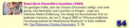 Geist lässt Neonröhre leuchten (2005) Die geistigen Kräfte, über die Christos Drossinakis verfügt, sind stark genug, eine Neonröhre zum Leuchten zu bringen - sogar aus mehreren Metern Entfernung. Das belegt ein faszinierender Test vor laufenden Kameras, der am 3. August 2005 im “Wissenschaftlichen Forschungszentrum für Medizinische Biophysik” in Sofia stattfand.[4]