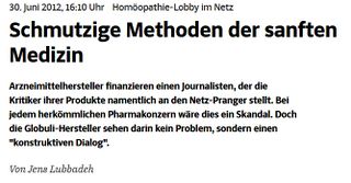 - ↑ Jens Lubbadeh: Homöopathie-Lobby im Netz - Schmutzige Methoden der sanften Medizin. Süddeutsche Zeitung, 30. Juni 2012