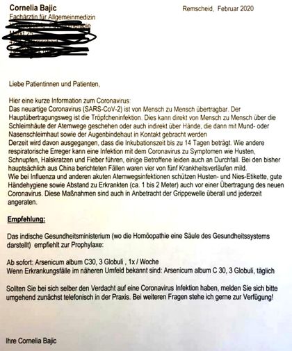 Nachdem von der Verbrauchschutzorganisation "Medwatch" die zuständige Ärztekammer Nordrhein eingchaltet wurde, wurde der Brief mit der Empfehlung bei facebook gelöscht.[13] Die amerikanische Vertretung des Homöopathie-Pharmaunternehmen Boiron riet explizit ab, Homöopathie im Falle einer SARS2-Coronavirus Infektion einzusetzen.