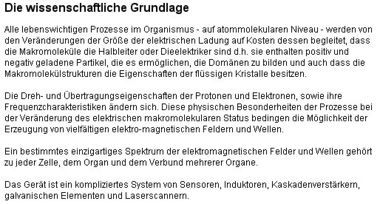 • Die wissenschaftliche Grundlage: Alle lebenswichtigen Prozesse im Organismus - auf atommolekularen Niveau - werden von den Veränderungen der Größe der elektrischen Ladung auf Kosten dessen begleitet, dass die Makromoleküle die Halbleiter oder Dieelektriker sind d.h. sie enthalten positiv und negativ geladene Partikel, die es ermöglichen, die Domänen zu bilden und auch dass die Makromolekülstrukturen die Eigenschaften der flüssigen Kristalle besitzen.