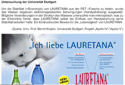Mit esoterischen Begündungen wird auch ein angeblich "elektrosmog-resistentes" und "feinclusteriges" Mineralwasser (auch als Babywasser oder Fastenwasser bezeichnet) auf Naturkostmessen präsentiert, das mineralienarme Lauretana-Wasser mit Herkunft aus einer Quelle im entfernten Piemonte (Norditalien). Aufgrund seiner Mineralienarmut solle es eine entschlackende Wirkung haben und "Gifte und Schlackenstoffe" wie ein Schwamm aufsaugen und Zellen ausspülen können. Das Beste am Lauretana-Wasser sei aber, dass es "rechtsdrehende Energien" beinhalte, um "Blockaden im Meridiansystem zu lösen und damit Krankheiten vor[zu]beugen." Während alle anderen Flaschenwässer durch die Einwirkung eines Mobiltelefons in ihrer Struktur "destabilisiert" würden, "verstärke" sich die ideale Ausgangsstruktur von Lauretana "sogar noch". Dies habe an der Uni Stuttgart der Raumfahrtwissenschaftler Bernd Kröplin im Rahmen eines "Projektes Apollo" herausgefunden.