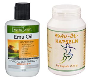Emu-Öl soll gegen verschiedene Krankheiten helfen, wie Hauterkrankungen, Allergien, Schmerzen, Arthritis, Stauchungen und Zerrungen.[1] Angewendet wird es entweder topisch (auf die Haut aufgetragen) als Öl, Lotion oder Creme oder oral, meist in Form von Kapseln.