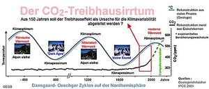 Der historische Verlauf der atmosphärischen Kohlendioxid-Konzentration (Keeling-Kurve) sei seiner Ansicht nach falsch[2], schon Mitte des 19. Jahrhunderts habe es atmosphärische Konzentrationen um 400 ppm gegeben (zum Vergleich: ca. 380 ppm im Jahr 2009), ohne dass diese zu einer messbaren globalen Erwärmung geführt hätten. Da Kohlendioxid in der Atmosphäre aktuell nur in einer Konzentration von 0,04% vorhanden sei, könne es unmöglich zu einer messbaren Erwärmung führen. Da Kohlendioxid überdies in einer für die Photosynthese aller Pflanzen suboptimalen Konzentration vorliege, sei ein Anstieg der Kohlendioxidkonzentration durch menschlichen Eintrag sogar zu begrüßen. Da die Mittelalterliche Warmzeit in Mitteleuropa überwiegend positive Effekte hatte, wird seiner Logik nach auch eine globale Erwärmung überwiegend positive Auswirkungen haben.