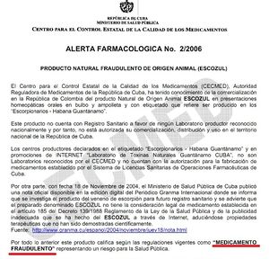 Die oberste kubanische Arzneimittelbehörde CECMED veröffentlichte schon vor einigen Jahren einen dringenden Warnhinweis, in dem ESCOZUL als "betrügerisches Naturprodukt" bezeichnet wird, das ein "Risiko für die Öffentlichkeit" darstelle.[12]