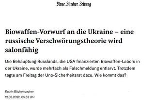 - ↑ Katrin Büchenbacher: "Biowaffen-Vorwurf an die Ukraine – eine russische Verschwörungstheorie wird salonfähig", Neue Zürcher Zeitung 12.3.2022, Online: https://www.nzz.ch/international/biowaffen-vorwurf-an-ukraine-eine-russische-desinformation-nzz-ld.1674088 Biowaffen-Vorwurf an die Ukraine – eine russische Verschwörungstheorie wird salonfähig