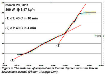 Bei einer Umgebungstemperatur von 31,8 Grad soll 26,5 Grad warmes Kühlwasser über die bereits bekannte Dosierpumpe der Firma LMI auf 100,1 Grad erhitzt worden sein, wobei dabei das gesamte Wasser verdampft sei. Als Wasserfluss gibt Rossi selbst den unwahrscheinlichen Wert von 7 kg/Std an (117 gr/min, 1,94 gr/s). Wenn man jedoch ein Video, das vom Beobachter Steven Krivit gemacht wurde, anhört, zeigt sich dass die Pumpfrequenz ("stroke-Wert") bei 20-24 strokes/min lag.[68] Somit musste der Wasserfluss unter 48 Gramm pro Minute gelegen haben (entsprechend 0,8/s, 2,88 kg/Std). Auf einem von Beobachter Passerini gemachten Bild der Pumpe ist ist eine Pumpfrequenz von etwa 40 als Einstellung sichtbar (80 ml/min, 1,33 ml/s, 4,8 l/Std). Allerdings bleibt unklar ob das Bild während des Versuchs gemacht wurde. Die Temperaturkurve des Kühlwasser zeigt ebenfalls einen Verlauf, der mit der angeblichen Durchflussrate von 7 kg/Std nicht sinnvoll in Einklang zu bringen ist: das Kühlwasser stammt aus einem Wasserkanister mit von oben eingesteckter Temperatursonde, die etwa 25 cm lang ist. Beim Abpumpen des Wasser gerät die Sonde aus dem Wasser und nimmt sehr schnell Lufttemperatur an. Wie aus Screenshots der Kurve auf einem Notebook ergibt, war am Vormittag relativ viel Wasser abgeflossen, sodass die Sonde recht bald in der Luft hing. Am Nachmittag hingegen, wurde offenbar der Durchfluss gedrosselt. Während mindestens drei Stunden hing die Sonde in Wasser (etwa von 12:00 bis 15:00). Dies bedeutet, dass in diesen drei Stunden maximal 9 Liter (die sich aus den Abmessungen des Kanisters und der Länge der Sonde ergeben) abgeflossen sein können, was etwa 3 Liter pro Stunde entspricht, und somit dem errechneten Wert der sich aus der hörbaren stroke-Frequenz der Pumpe entspricht. Um auf 7 Liter/Std zu kommen, hätte jemand heimlich 4 Liter Wasser mit 26,5 Grad nach gießen müssen. Die Zumischung kalten Leitungswassers hätte sich auf der Temperaturkurve gezeigt.