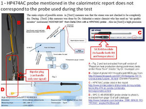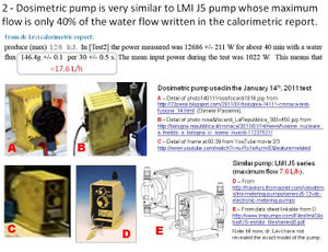 Ungereimtheiten: Zum Experiment wurden kurz danach nicht nachvollziehbare Angaben gemacht. Auch Wochen später reagierte das Rossi-Team nicht mit einer Korrektur der Angaben. Nicht nur die Dauer des Experiments ist mit 17 Netto-Minuten (in denen die Temperatur nahe bei oder über 100 Grad lag) kürzer als ansonsten verbreitete Angaben, sondern auch hinsichtlich anderer Angaben ergeben sich Gründe, an den Informationen der Erfinder und Durchführer des Experiments zu zweifeln. Im Nachhinein wurde die Energieschätzung durch Verdampfen von Wasser (Phasenwechsel) in "www.physicsforums.com" und durch weitere Beobachter kritisiert, da entsprechende Berechnungen von trockenem Dampf ohne Anteile von kondensiertem Wasser ausgingen, was nicht erwiesen sei. Ein im Video gezeigtes Hochtemperatur-Thermometer kann lediglich die Temperatur, nicht aber die relative Feuchte messen. Behauptet wurde der Einsatz einer Kombi-Messsonde des Typs HP474AC (Delta Ohm), tatsächlich ist im Video jedoch eine anders aussehende Sonde zu sehen, die wie eine SPC C45 0500 BEX-Sonde aussieht. Die HP474AC-Sonde ist nirgends in einem der Videos zu sehen. Auch wurde der behauptete Wasserfluss von 292 ml/Min (=17,5 l/h) bezweifelt, da die verwendete Pumpe laut Hersteller nur die Hälfte der genannten Förderleistung habe. Eingesetzt wurde eine Förderpumpe des Typs "LMI P18", wie der schwedische Journalist Mats Lewan im Mai 2011 bestätigte. Mehrere vorherige Anfragen bei Andrea Rossi nach dem Typ der verwendeten Pumpe wurden nicht beantwortet.[53]. Der Hersteller gibt für die LMI P18 eine maximale Förderleistung von 12,1 l/h an.[54] Andere Modelle der LMI (A/B/C) sehen deutlich anders aus. Diese programmierbaren Peristaltikpumpen sind in ihrer Förderleistung einstellbar. Getrennt lässt sich die Anzahl der "strokes" (Hübe pro Minute) und des jeweils gepumpten Volumens einstellen. Die maximale Anzahl von strokes ist 100 pro Minute. Bei 100 strokes/min wird die maximale Förderleistung erst erreicht. In einem der YouTube-Videos von der Vorführung am 14. Januar 2011 ist der Pumpvorgang für 30 Sekunden deutlich zu hören.[55] Zählt man die strokes, so lassen sich 29 oder 30 Pumphübe in dreißig Sekunden hören. Die stroke-Frequenz ist somit 59 bis 60 pro Minute, und die zum Zeitpunkt des Experiments eingestellte Pumpleistung liegt somit bei 60% der maximalen Pumpleistung. Folglich ist die vom Team genannte berechnete Wärmeleistung um 240% höher, als sie tatsächlich bei Anwendung der im Video sichtbaren Pumpe möglich wäre und somit mit Sicherheit falsch. Durch die falsche Angabe der zugeführten mittleren Leistung (1.073 W statt 600 W) ergibt sich ein zusätzlicher erheblicher Fehler von 78%. Wären auch nur wenige Prozent kondensiertes Wasser im Dampf vorhanden gewesen, wäre die Dampfbildung alleine durch die zugeführte elektrische Heizleistung erklärbar. Im Bericht zum Experiment wird erwähnt, dass die verwendete Wasserstoffflasche vor und nach dem Versuch gewogen worden sei, um die Menge des entnommenen Wasserstoffs auf weniger als ein Gramm genau zu bestimmen. Die Masse der Druckflasche wird mit unterschiedlichen Werten angeben, lag aber wohl bei 13,66 kg. Waagen, die in diesem Wägebereich (bis 20/30/60 kg) angeboten werden, haben jedoch höchstens eine Ablesemöglichkeit (d) von 0,1 Gramm, nicht jedoch eine entsprechende Genauigkeit. In Frage kommende Waagen auf dem Markt bieten allerhöchstens eine Genauigkeit von 0,2 bis 0,4 Gramm.[56]