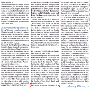 - Zu einem Leserbriefschreiber, der über ein taubes Gefühl in der Unterlippe und damit verbundene Schwierigkeiten beim Essen berichtet: Auf Deine ehrliche Antwort, auf Angabe Deines Alters und warum Du nicht naturgerecht gelebt hast, warum Du in den BFG eingetreten bist, warte ich also! Falls Du nichts um meine Ratschläge gegeben hast, wird’s höchste Zeit, das nachzuholen, um einem schlimmen Leben im Rollstuhl zu entgehen. Du kannst aber auch jetzt zur Ärztemafia rennen und Dich mit Kortison vollpumpen lassen, statt jetzt gleich nach draußen zum Jogging oder strammen Wandern zu eilen. Nach meiner Erfahrung sind MS-Leute nicht gerade bewegungsfreudig...[23]