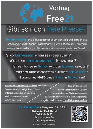 Free21 (Bezeichnung abgeleitet von der UN-Agenda 21) ist der Name eines deutschsprachigen Blogs, welches im Verlag GlobalFairHandeln in Kerpen[2] erscheint. Gründer war der am 18. August 2018 an Lungenkrebs verstorbene Däne Tommy Hansen, ein Intimus des unter Antisemitismusvorwurf stehenden Ken Jebsen. Hansen lebte ab 2014 in Berlin. Der gelernte Schriftsetzer Hansen bezeichnete sich auch als investigativer Journalist. Nach eigenen Angaben finanzierte er das Projekt aus Spenden. Gespendet werden soll an einen Verein zur Förderung unabhängiger journalistischer Berichterstattung e.V.,[3] dem Marika Matthaei vorsteht. Für den Vertrieb soll Lukas Puchalski zuständig sein. Seit dem 1. Oktober 2019 ist Dirk Pohlmann Chefredakteur bei Free21 und sein Name wird im Impressum genannt.[4]