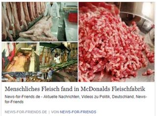 Webseite von "News for Friends", auf der die sehr alte und widerlegte Verschwörungstheorie "„MCDONALDS EXPOSED FOR USING HUMAN MEAT!”" der Satireseite Hutzlers verbreitet wird