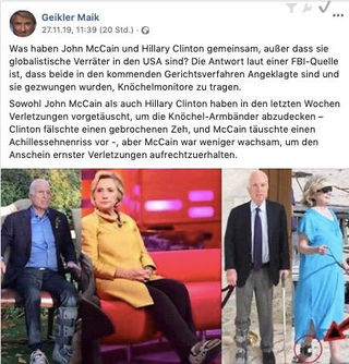 An der Verbreitung dieser Verschwörungstheorien war Qanon beteiligt, eine Desinformationsquelle der US-amerikanischen rechten Szene. In Deutschland beteiligte sich der deutsche Immobilienmakler und Reichsbürger Maik Geikler (nach Eigenangaben Maik Friedrich Geikler) an der Verbreitung der Fußschienen-Verschwörungstheorie. Ende November 2019 behauptete der "Großherzog" auf seinem Facebookprofil von einem FBI-Kontakt von einer Verfahrenseröffnung gegen die US-Amerikanischen Politiker Hilary Clinton und den bereits verstorbenen John McCain erfahren zu haben. Um seiner Aussage mehr Glaubwürdigkeit zu verleihen führte Geikler aus, sowohl Clinton also auch McCain hätten in den vorhergehenden Wochen Verletzungen im Bereich des Unterschenkels vorgetäuscht um Elektronische Fußfesseln zu verbergen. Geikler ist selbsternannter "Großherzog von Mecklenburg-Strelitz und Mecklenburg-Schwerin".