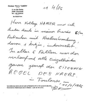 Ein 13 Zeilen umfassendes "Schreiben" ohne Briefkopf, in dem fünf Unterzeichner (darunter Hamer selbst) die Reproduzierbarkeit der „eisernen Regeln des Krebses“ an sieben Patienten gefunden haben wollen. Ein Stempel weist den Wiener Arzt Jörg Birkmayer als Unterzeichner aus. Über Methodik der Untersuchungen und exakte Ergebnisse bietet das Dokument keinerlei Informationen. Als "Verifikation" ist es daher völlig ungeeignet.[2]