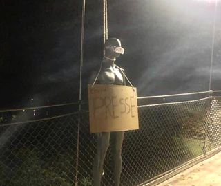 In sozialen Medien des Internet kam es wiederholt zu Morddrohungen gegen Journalisten von Gegnern der Corona-Schutzmaßnahmen. So wurde an einer Weser-Brücke in Minden eine an einem Strick hängende Schaufensterpuppe mit dem Schild „Covid-Presse“ vorgezeigt, die einen Journalisten darstellen soll.[7] (siehe auch Bild rechts) Im April 2021 wurde bekannt, dass "Reporter ohne Grenzen" Deutschland aus der Spitzengruppe der "Rangliste der Pressefreiheit" herabgestuft haben. Grund dafür waren die vielen Angriffe auf Journalisten vor allem bei Querdenker-Demonstrationen: