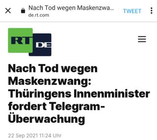 Der russische Staatssender RT DE verbreitete am 22. September 2021 einen Artikel mit dem zweideutigen Titel "Tod wegen Maskenzwang".