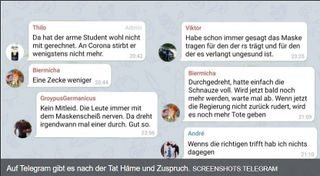 - Die Gegner der Corona-Regeln radikalisierten sich Hand in Hand mit rechten Verschwörungsideologen immer stärker. Und, so warnen Sicherheitskreise, sie schrecken offenbar auch vor schweren Gewaltakten und Anschlägen nicht mehr zurück.[5]