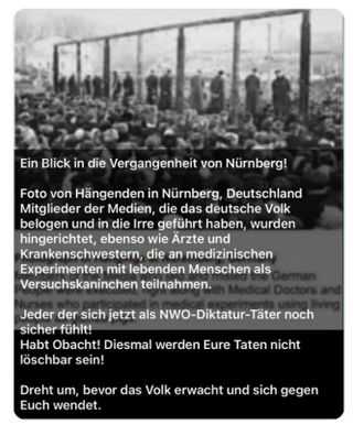 In Mainz applaudierten Gegner der Corona-Maßnahmen dem AfD-Politiker Stefan Räpple, der bei einer Demo zum gewalttätigen Umsturz der Regierung aufrief. Gegner der Corona-Schutzmassnahmen zeigen auf Demonstrationen Bilder von Virologen, Politikern und Journalisten hinter Gittern. Es stellte sich heraus, dass zumindest teilweise die entsprechenden Bildern von Mitgliedern der Partei AfD stammten. Sehr ähnliche Bilder waren bereits zuvor beim anonymen Portal Propagandaschau verbreitet worden, und zeigten Journalisten in Sträflingskleidung.