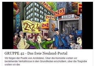 Hinweis: die hier thematisierte Gruppe42 ist nicht mit einer gleichnamigen Gruppierung von Mitgliedern der deutschen Piratenpartei[8], der tschechischen Künstlergruppe Gruppe 42[9] sowie der österreichischen Unternehmensberatung Gruppe 42 zu verwechseln.