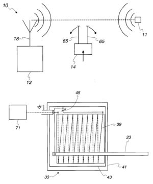 Zeichnungen aus US-Patent 6,344,818. Oben: Grundprinzip mit "target material" (11), Quellenmodul (12) und Detektormodul (14). Unten: Detektormodul mit Antenne (23), Spule (39) und Modulator (71)