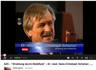 Scheiner ging auch davon aus, dass durch die Funkwellen des Mobilfunks ab 100 µW/cm2 die Blut-Hirn-Schranke des Menschen "aufbreche" und damit "Giftstoffe" ins Gehirn gelangten und "Nervenzellen zerquetscht" würden.[7] Es komme zu einer "Überhitzung des Nervengewebes" und bei Kindern führe das Telefonieren mit Mobiltelelefonen zum Grauen Star. Durch von Mobiltelefonen angeblich bewirkte "biologische Irritationen" der Zelle komme es auch zu einer Störung von "ultraschwachen Laserstrahlen", die identisch mit einer von Fritz-Albert Popp entdeckten Biophotonenstrahlung und gleichsam als "kleinste Energiekorpuskel" in der "DNS-Spirale" des Zellkernes beheimatet seien. Die Folge einer hypothetischen "Blockade von Informationsgehalten" der DNA führe nach Scheiner zur Entstehung von Krebszellen. Er berief sich auch auf Ulrich Warnke, von dem er erfahren habe, dass elektromagnetische Felder zu einem "pathologischen Energiedefizit" (PED) in der Zelle führten, das angeblich identisch mit dem Chronic Fatigue Syndrom (CFS) sei.