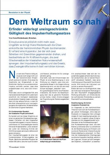 Wissenschaftlich zu nennende Veröffentlichungen in Fachzeitschriften gibt es von Weidenbusch nicht. Zweimal waren seine Erfindungen Gegenstand von Artikeln in der Esoterikzeitschrift Raum & Zeit des Ehlers Verlags. Im Heft 130/2004 behauptete er: "Erfinder widerlegt uneingeschränkte Gültigkeit des Impulserhaltssatzes".[5] Im Heft 166/2010 folgte ein Artikel des Autors Detlef Scholz mit dem Titel Energie aus dem "Nichts" - Hans Weidenbusch stellt ein Perpetuum mobile vor.