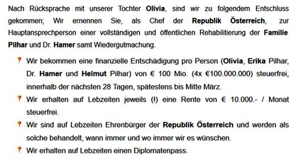 2017 forderte Helmut Pilhar vom österreichischen Bundespräsidenten Alexander van der Bellen viermal 100 Millionen Euro “Entschädigung” für sich, seine Frau, seine Tochter Olivia und Ryke Geerd Hamer.[18]