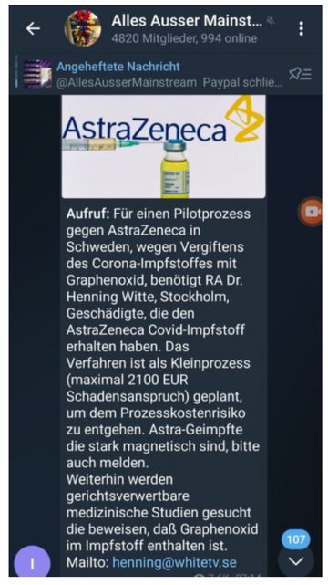Ankündigung von Henning Witte das Pharmaunternehmen AstraZeneca zu verklagen, wegen angeblichem Inhaltsstoff Graphenoxid in Corona-Impfstoff (siehe dazu: Artikel Impfmagnetismus)