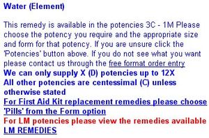 Zu den Kuriositäten der Homöopathie zählt das Angebot verdünnten Wassers als homöopathisches Heilmittel (siehe Abbildung rechts, 1 Gramm verdünntes Wasser kostet etwa 1 Pfund)[16] sowie die Behauptung, auch von unter dem Kopfkissen oder am Körper getragenen Mitteln ginge eine heilende Wirkung aus.