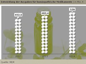 Nach Angaben des MDR lagen die Ausgaben für homöopathische Präparate 2012 bei 452,5 Miliionen, 2013 bei 482,4, 2014 bei 528 und 2018 bei 670 Millionen Euro. Nach anderen Angaben (apotheke-adhoc, 2016) geben Verbraucher in Deutschland pro Jahr 734 Millionen Euro für Homöopathie-Präparate aus.[60] Die Selbstmedikation entsprach dabei 2017 einem Umsatz von 626 Millionen Euro. Insgesamt werden über 50 Millionen Packungseinheiten pro Jahr verkauft. 2017 waren es mehr als 53 Millionen Packungen.[61] Führende Anbieter sind DHU, Heel, Hevert, Pflüger, Orthim und Pascoe.[62] Nach Angaben des Bundesverbandes der Pharmazeutischen Industrie zahlten die gesetzlichen Krankenkassen 9 Millionen Euro für homöopathische Mittel. Nicht mit eingerechnet sind hier jedoch die Folgekosten für ineffektive homöopathische Therapien. Nicht bekannt sind die Kosten homöopathischer Erst- und Folgeanamnesen, die meist vom Patienten selbst bezahlt werden müssen.