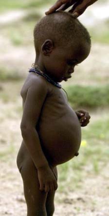 - Adaptierte Hungerphase, ab 5 Tagen der Nahrungslosigkeit. Dieser Zeitraum ist durch Energieeinsparungsmechanismen und den Fettabbau gekennzeichnet. Täglich werden etwa 150 g Triglyceride (Körperfett) aus dem Fettgewebe zu Fettsäuren und Glycerin abgebaut. Es beginnt die Phase der Hungeradapation, also der Anpassung des Organismus an die fehlende Nahrungszufuhr. In den Muskeln findet eine vermehrte ß-Oxidation von Fettsäuren zu Acetyl-CoA statt, die im Citratcyclus zur ATP-Gewinnung genutzt wird. Ketonkörper erscheinen vermehrt im Blut. Diese stammen aus der ß-Oxidation von Fettsäuren. Die Hungeradaptation führt zur Glucoseeinsparung, statt eines Glukosebedarfs von anfänglich 5 Gramm pro Kilogramm Körpergewicht pro Tag, sinkt der Bedarf im Hungerzustand auf etwa 2 bis 3 Gramm ab. Zu einem späteren Zeitpunkt wird sogar nur noch etwa 1 Gramm pro kg und Tag benötigt. Der Mensch lebt nun sozusagen "auf Sparflamme". Allgemein ein Zustand der unfreiwillig Millionen Menschen in unterschiedlicher Ausprägung in Hungergebieten der Welt betrifft. In den späten Hungerphasen kommt es zum gefährlichen Abbau von Eiweißen. Der Mensch verfügt im Durchschnitt über etwa 12 kg Eiweiße, von denen er im Hungerzustand 50 bis 80 Gramm pro Tag verlieren kann. Den größten Substanzverlust erleidet dabei die Leber, die um bis zu 40% ihres Gewichts verlieren kann. Es können sich Hungerödeme durch Wasseransammlung im Gewebe bilden, als Zeichen des Eiweißmangels. Der Eiweißverlust wirkt sich auch auf das Immunsystem aus: Es kann zu häufigeren Infekten kommen.